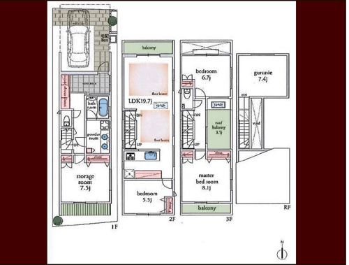 □1F面積/44.52㎡ □2F面積/45.17㎡ □3F面積/34.49㎡